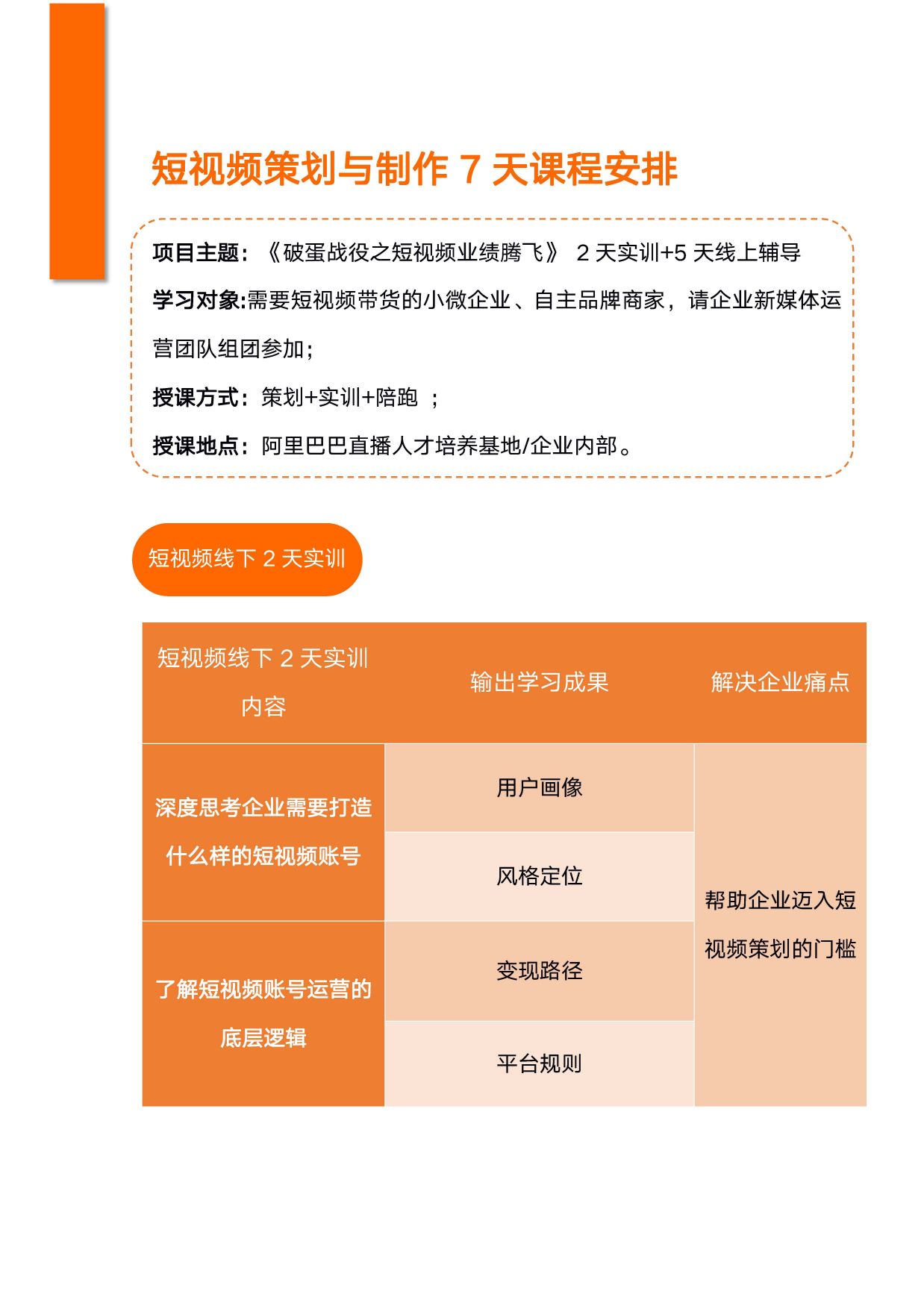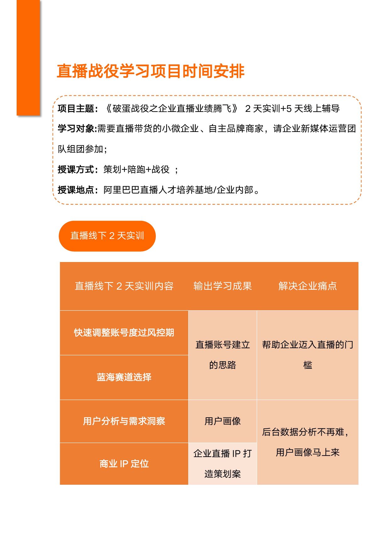 60%授課+25%實操演練+15%點評,理念之道深入和案例分析淺出。豐富性與實用性,邏輯性與幽默感,創(chuàng)造性與干貨型,案例來源于企業(yè)咨詢輔導實際經驗。